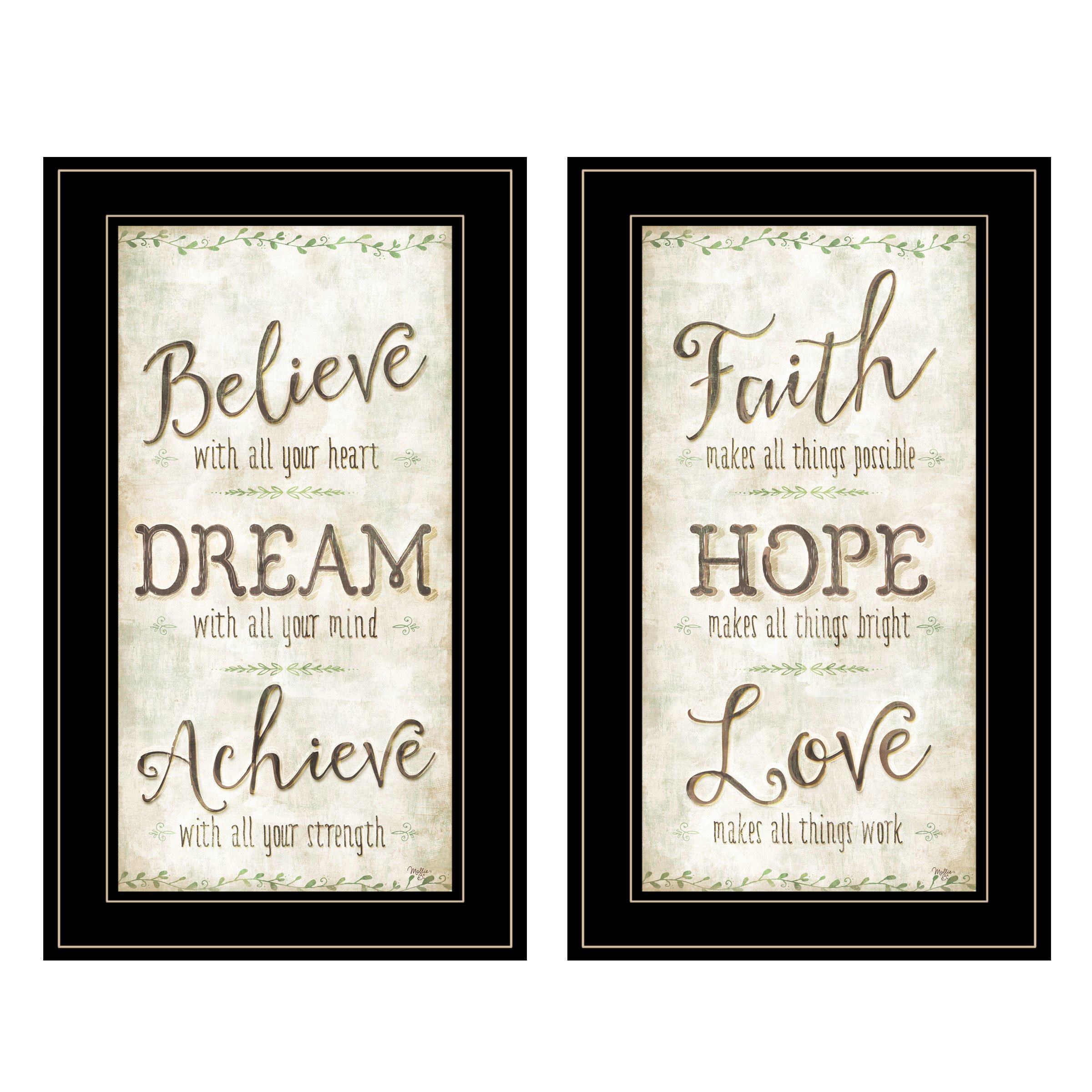 V467-704G Faith / Believe, by artisan Mollie B. This decorative black framed vignette of 2 (12 x 21) framed prints speak of Faith, Hope and Love. Framed prints arrive ready to hang. Prints are textured-no need for glass•TEXTURED ARTWORK with a 'rolled on' acid-free acrylic coating to create a canvas painting effect.•UV PROTECTANT COATING protects artwork from fading. No glass is necessary.• MOULDING adds natural beauty to the framed art. Frame is keyholed for the easy hanging.•THIS FINE HOME DECOR piece made in the USA by Woman Owned Business (WBE) is a perfect gift for a friend or relative.