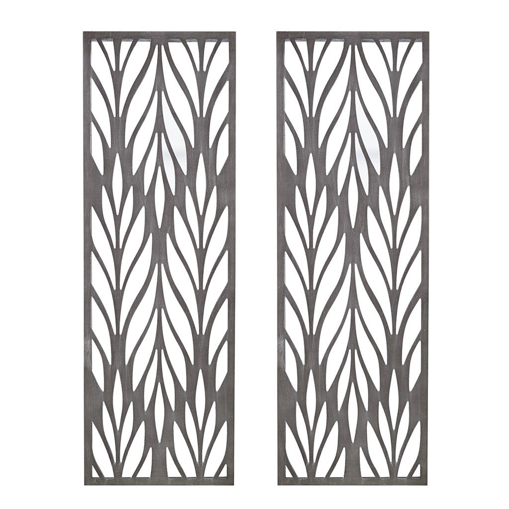 The Madison Park Florian Grey Laser Cut Wood 2-piece Panel Wall Decor Set by Artist Emily Warne offers a simple and elegant addition to your home decor. Featuring an intricately carved botanical design, each wall panel flaunts a reclaimed grey hue with a light sheen and luster for an updated modern look. The 4 D-rings on the back of each piece allow this panel set to be hung both vertically or horizontally, giving you added versatility to fit any space. Perfect for your living room, bedroom, or entryway, this botanical wall decor comes as a set and each panel measures 36x12". Spot clean only.