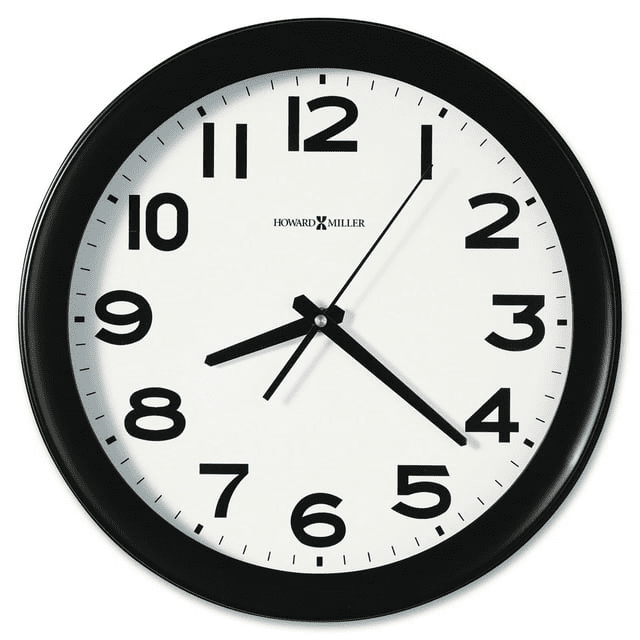 Howard miller kenwick wall clock in black color has bold hour and min hands that stand out against white dial face. Clock has an overall diameter of 13 1/2" and supports quartz movement to ensure accurate results.