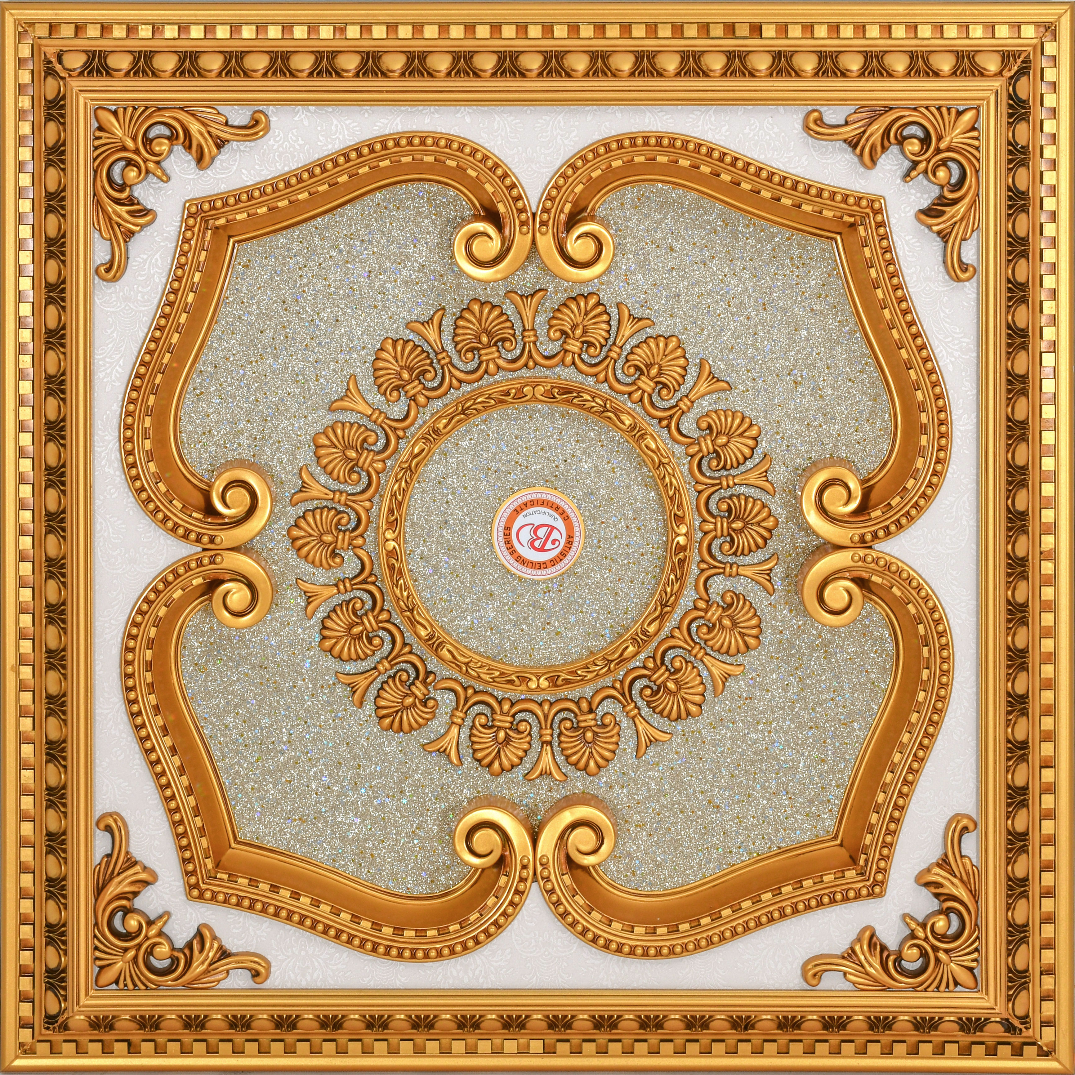Add a touch of elegance and sophistication to your space with the Beige and Gold Clover Square Chandelier Fan Ceiling Medallion. This exquisite medallion measures 32 inches in width and height, with a depth of 4 inches, making it an ideal size to complement a variety of chandeliers or ceiling fans. Featuring a beautiful beige background accented with gold clover detailing, this medallion exudes a classic charm that enhances any decor style, from traditional to contemporary. The intricate clover pattern adds a touch of luxury and intricacy, making the medallion a striking focal point in your room. Whether you're aiming to elevate the style of your dining area, living room, or bedroom, this ceiling medallion provides the perfect finishing touch. It not only enhances the aesthetic appeal of your lighting fixtures but also adds architectural interest to your ceiling, creating an elegant ambiance in your space. Easy to install and designed to fit seamlessly with various interior designs, the Beige and Gold Clover Square Chandelier Fan Ceiling Medallion is a versatile and stylish choice for those looking to enhance their home's decor with a touch of timeless elegance and refined beauty.