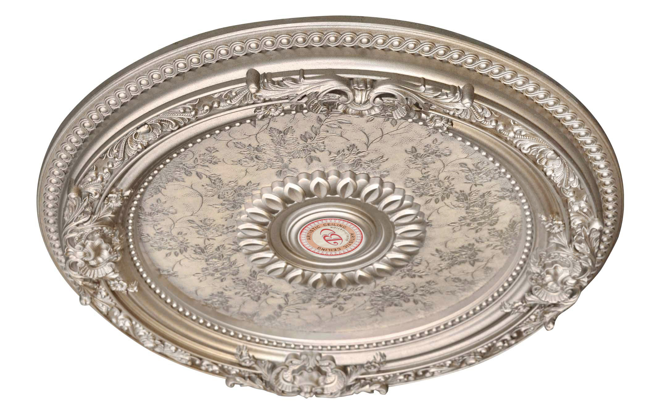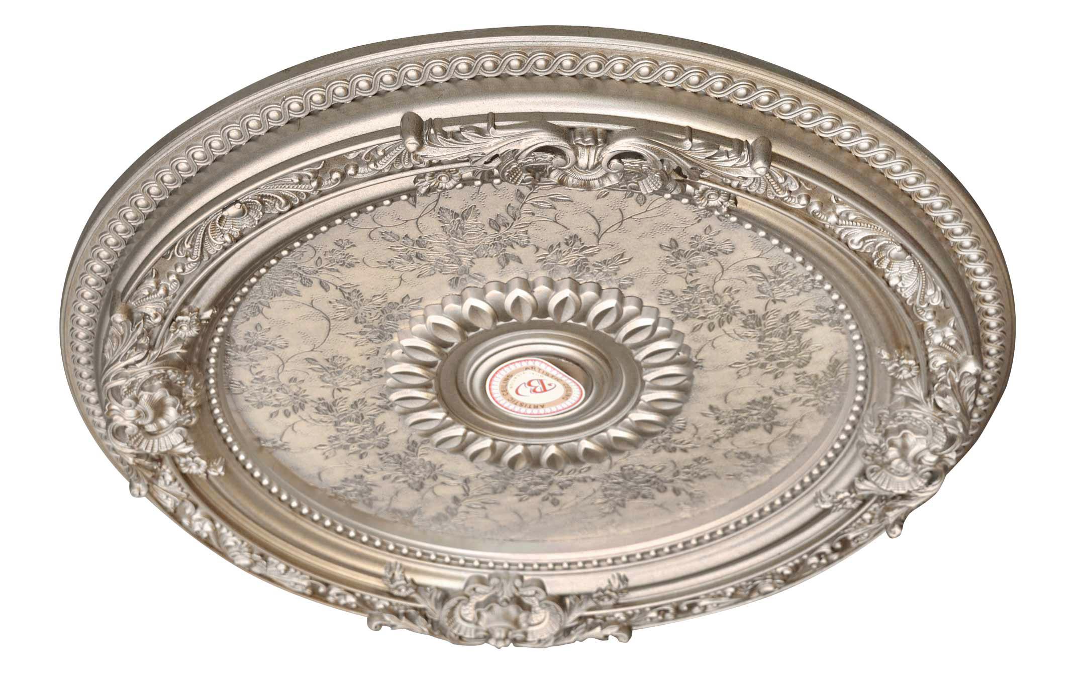 The Petite Round Champagne Ceiling Medallion 24 Inch Diameter is a classic round decorative ceiling Medallion or Coin. Finished in a softened Silver with a light wash of Gold, our Champagne Silver Medallion features a recessed center panel with slightly raised floral pattern detail, offering a luxurious finish in a stylish design. The item comes fully finished out of the package and is Hand Cast in a lightweight Polystyrene that will never shrink, split or crack. The medallion is designed with a 1.5 inch center hole that allows for the easy use as a crown for chandeliers, light fixtures, and fans. This beautiful ceiling medallion adds stunning architectural detail to otherwise plain open ceiling spaces. Installation can easily be done with architectural adhesive and finishing nails. Instantly provide your ceiling spaces with rich architectural details that are long lasting, maintenance free, and add value to your home at an affordable price.