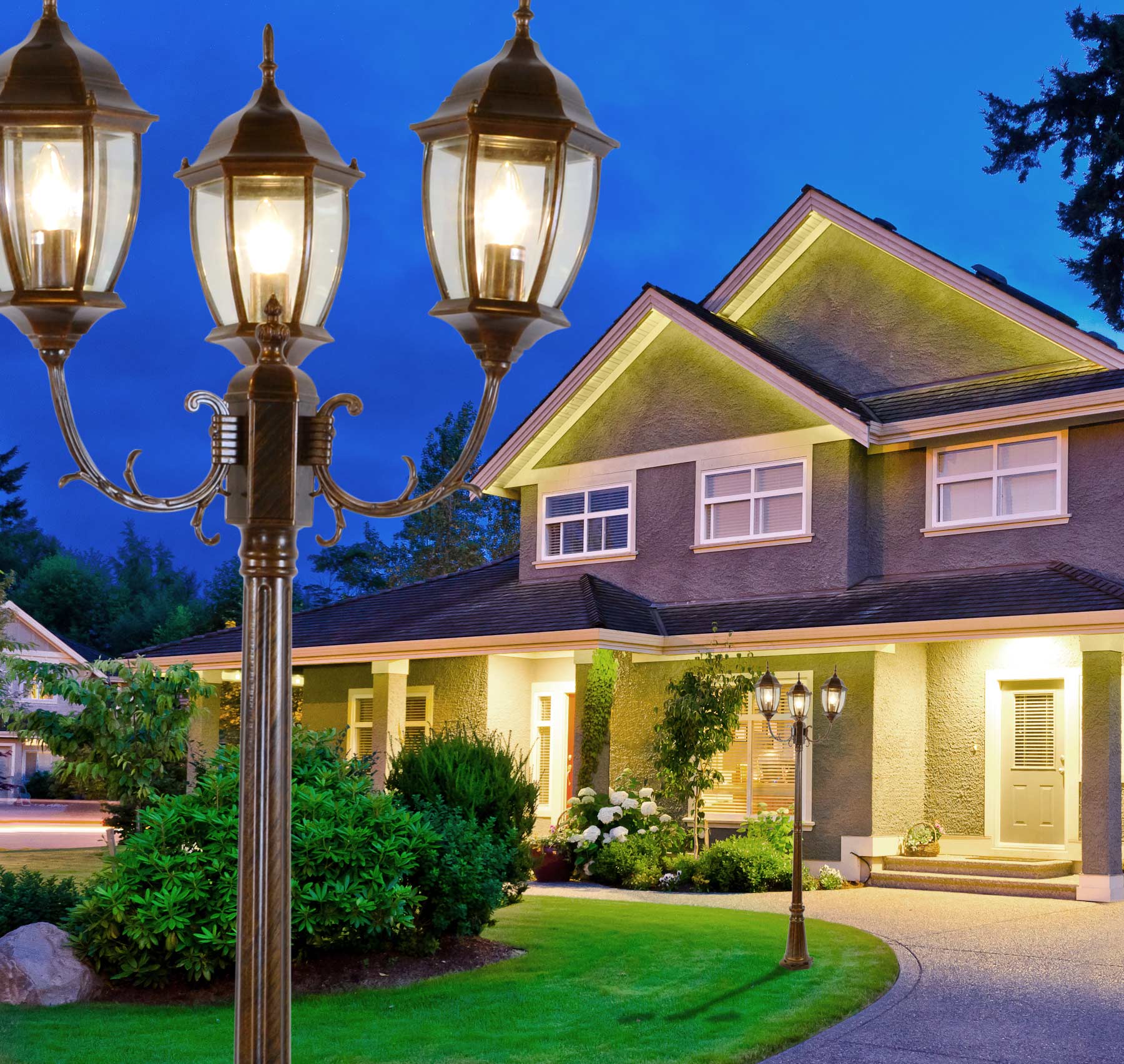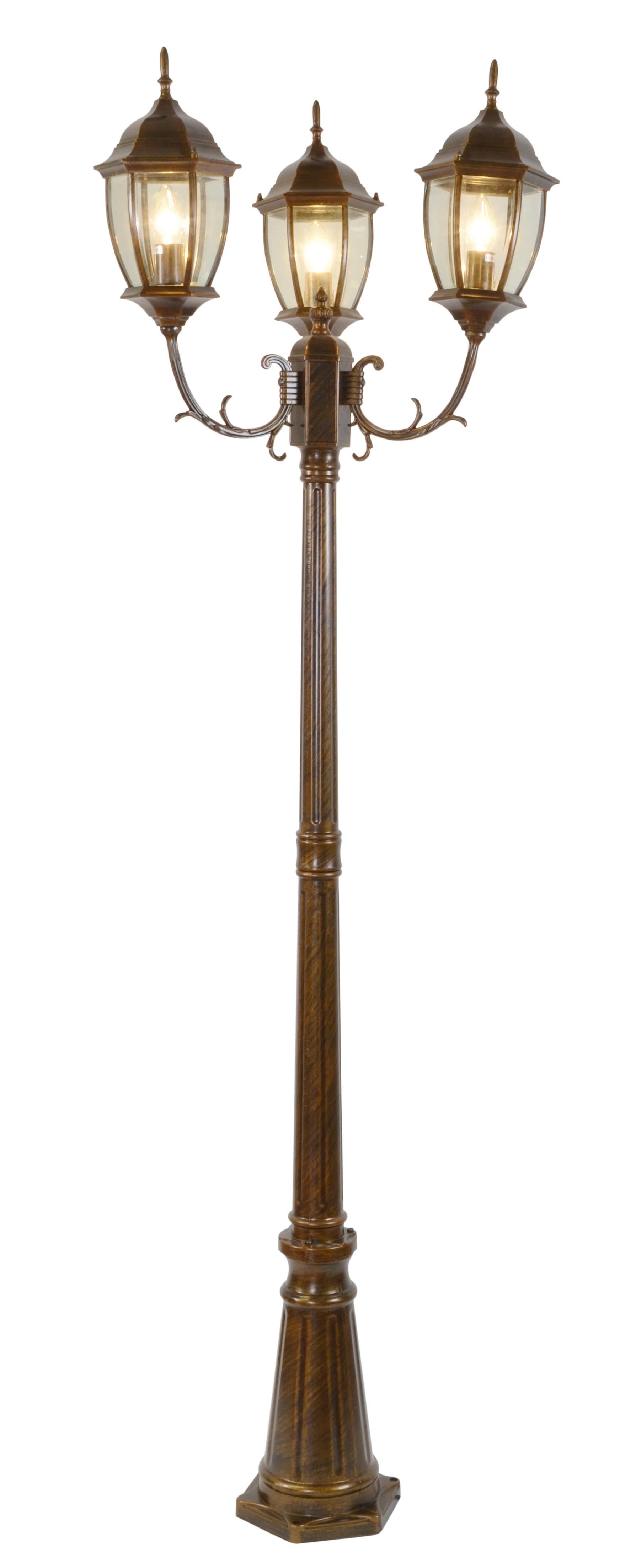 The Elegant Aston 3 Light Street Lamp is over 7ft in height and is constructed of cast aluminum. The lamp features 3 pre-wired lanterns with sockets and a brushed antique finish with bronze and copper tones. Main electrical wiring is necessary.