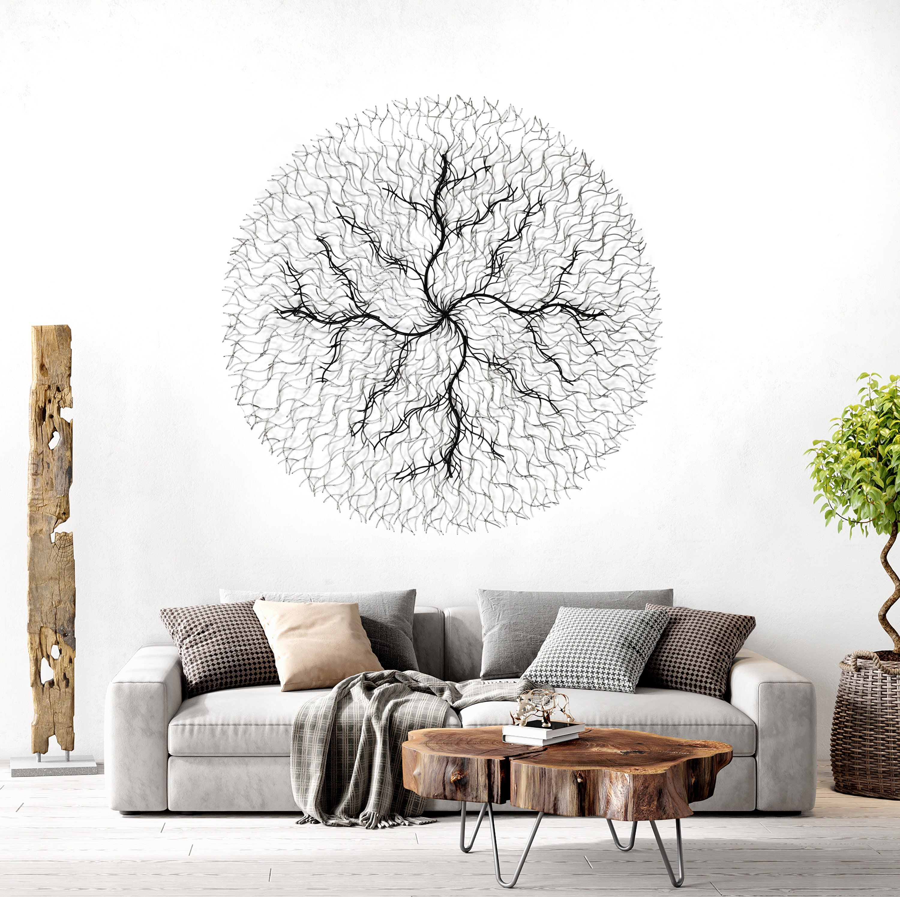 Elevate your decor with the nuanced Iron Wire Root Black Wall Décor, measuring 59 inches in diameter. This intricate piece intricately portrays the complexity of root structures, crafted with care from durable iron. What sets this wall hanging apart is its sophisticated finish: while predominantly black, it boasts rubbed silver highlights that trace the contours of its design, adding dimension and an element of visual intrigue. The interplay of black and silver creates a dynamic contrast, enhancing the texture and depth of the piece, making it a captivating addition to any space. This wall décor is adaptable across a range of settings, from minimalist modern interiors to more eclectic or industrial environments, offering both artistic value and a touch of elegance. Whether it's the centerpiece in a room or part of a larger wall arrangement, the Iron Wire Root Black Wall Décor with its silver accent provides a striking visual interest. It's perfect for anyone looking to introduce a sculptural, thoughtful element to their environment, combining natural inspiration with a refined, metallic finish for a truly standout piece.