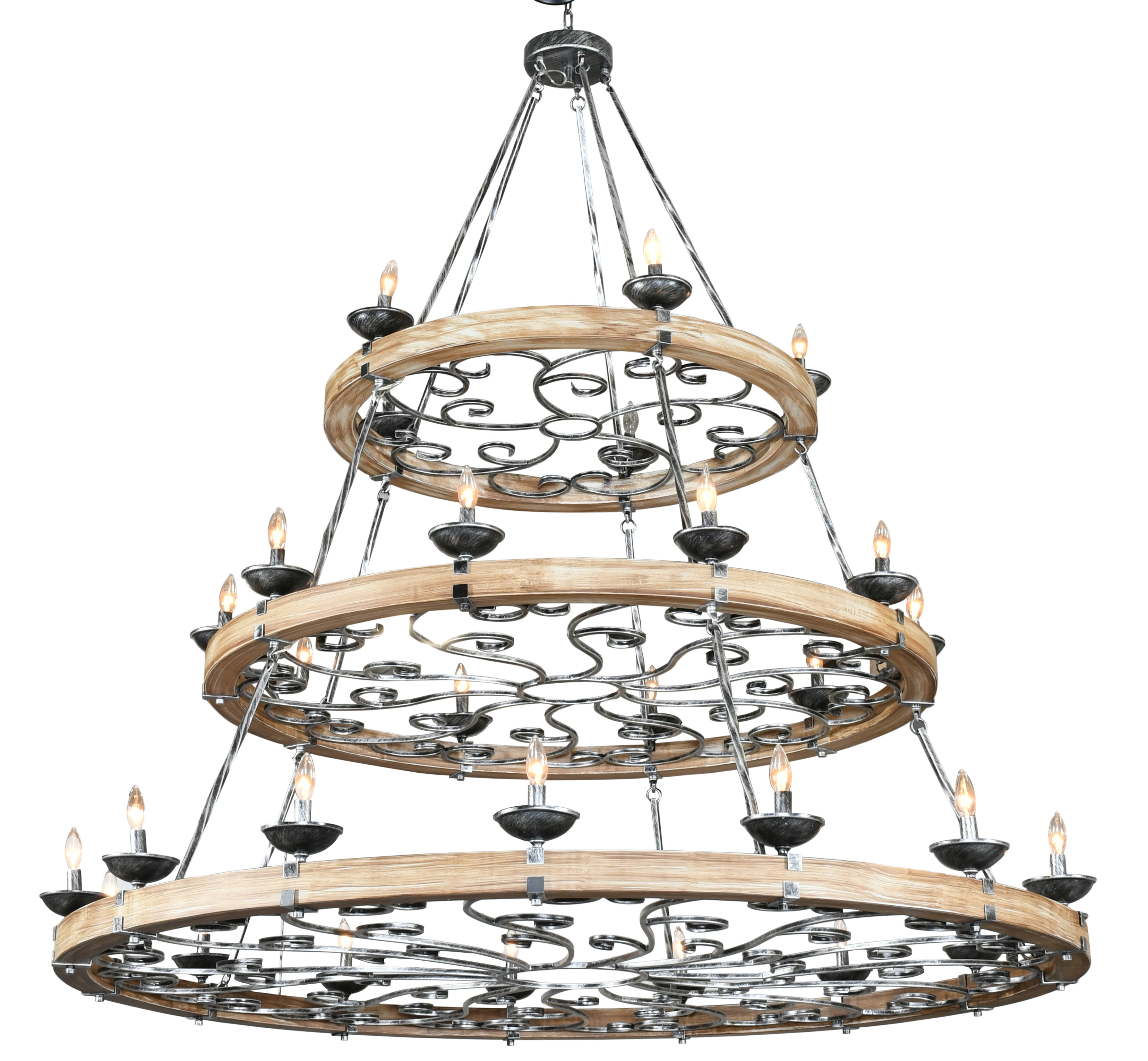 The Three Tier Ridge Line 75" Chandelier is a magnificent centerpiece that adds a dramatic rustic flair to any grand space. This expansive chandelier features three tiers of candle bulbs, a distressed wood frame, and vintage black rust metal components, making it a standout piece in any farmhouse or industrial setting.