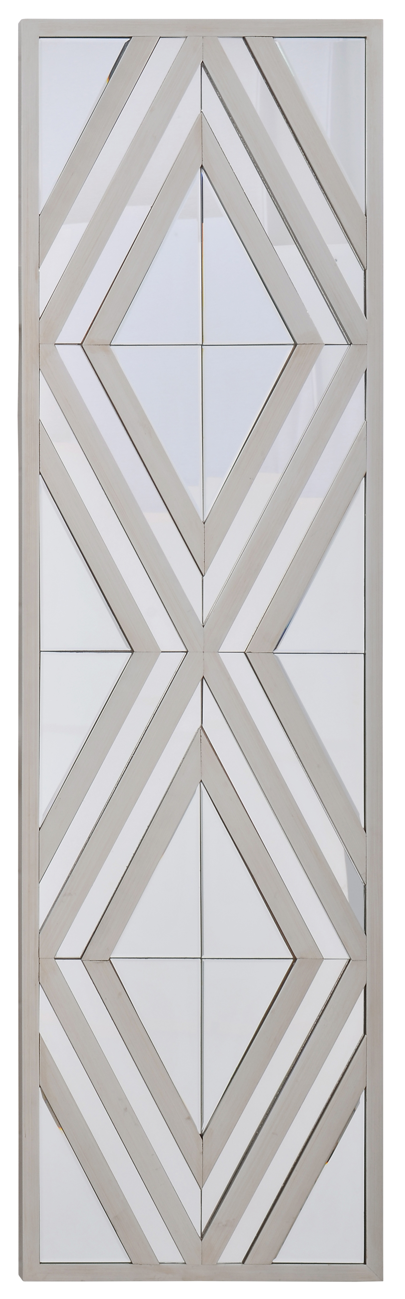 The Silver Aspen Diamond 72 inches Mirror measures 21.25 inches X 1.5 inches X 72.62 inches. The Aspen Series of mirrors is a modern collection of styles using diamond shapes and accent strips of mirror to create its stunning designs. The Silver Aspen offers a modern Silver Leaf finish. The finish and design combine to create a clean and beautiful mirror that would be easy to place and a nice addition to your home. The design is suitable for any modern to transitional Interior. The mirror comes with hanging hooks installed to allow either a vertical or horizontal wall installation. This fashionable mirror is another functional work of art by Timeless Reflections, the Finest quality beveled mirrors, and a division of AFD Home. No Assembly required
