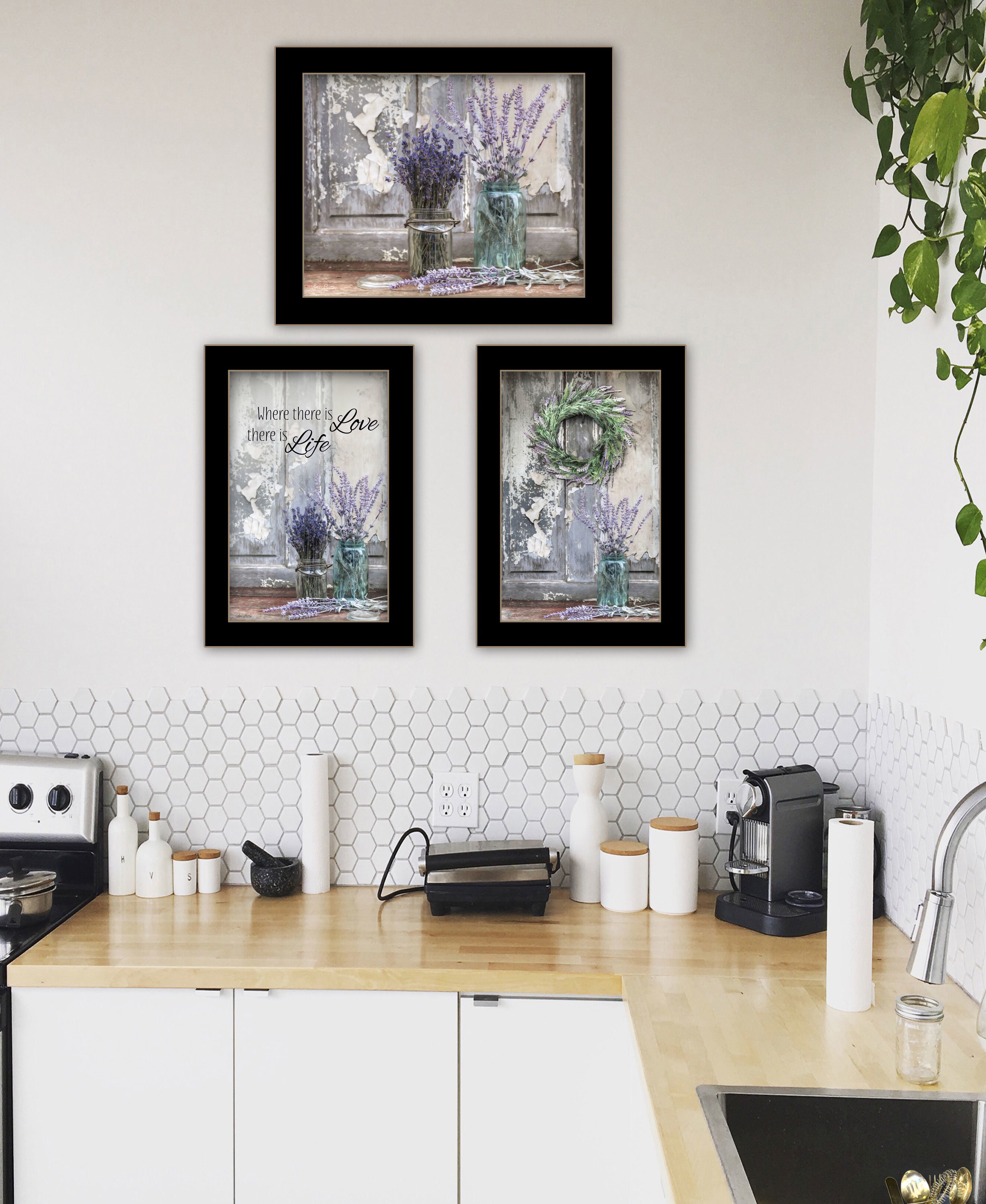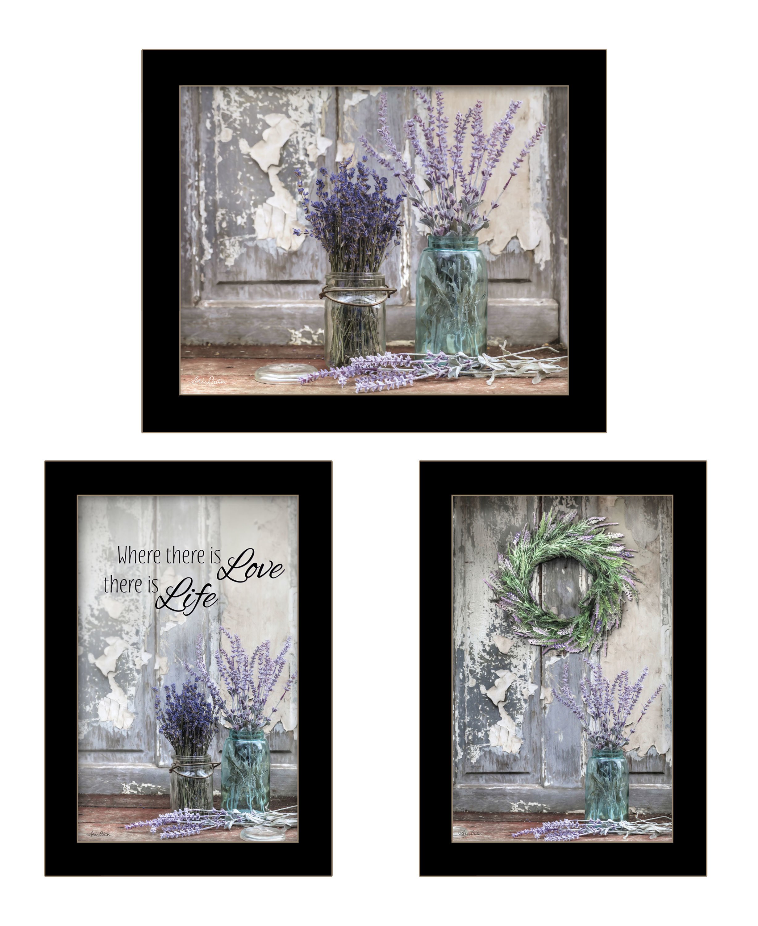 "Abundance of Beauty Collection" a 3 piece Vignette by Artisan Lori Deiter, 1-20"X14" & 2-14"X18" decorative black framed wall art. This vignette of 3 framed prints; Where there is Love there is Life, other very primitive print of lavender bases, and flowers. This will remind you of the smell of lavender and the love you have. Our products are proudly made by skilled American workers. The surface of our framed art is textured with a fade resistant coating, so no glass is necessary. A vegetable-based glue is used in the production of our products, and our frames are crafted from 100% recycled material. In keeping with our environmentally friendly approach towards manufacturing. Arrives ready to hang.•Print has fade resistant surface texture, no glass is necessary•Woman Owned Business (WBE)•Arrives ready to hang, no additional hardware needed on item•individually hand crafted by skilled American workers•Cleaning Instructions: Clean with Soft Dry Cloth Only•Made in U.S.A.•Artwork by American Artist