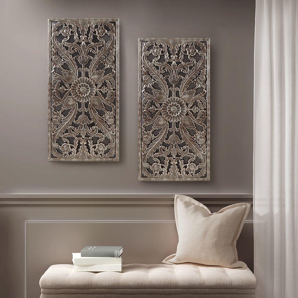 Complete your home decor with our Madison Park Botanical Panel Distressed Carved Wood 2-piece Wall Decor Set. This wall decor set features exquisite carved global botanical designs in a durable MDF material creating beautiful texture and dimension, while an antique silver and bronze coat finish adds a unique color and luster. Each piece is finished with two D-rings on the reverse making it easy to hang pieces, either side by side for a more clean look or staggered for a more stylized approach. Perfect for any Living Room, Dining Room, or Entry way - this carved wood panel 2 piece set is the perfect elegant touch to any decor.